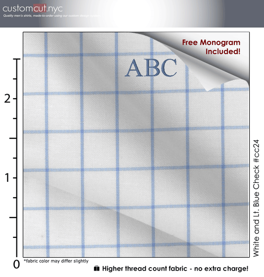 White and Lt. Blue Check #cc24, 100% Cotton Men's Monogrammed Custom Dress Shirt.